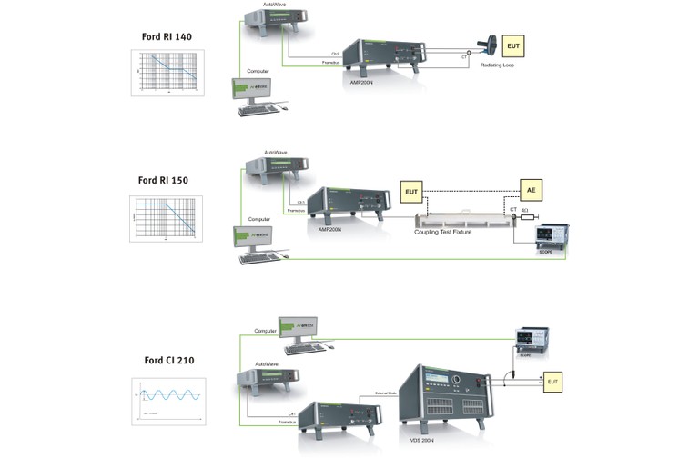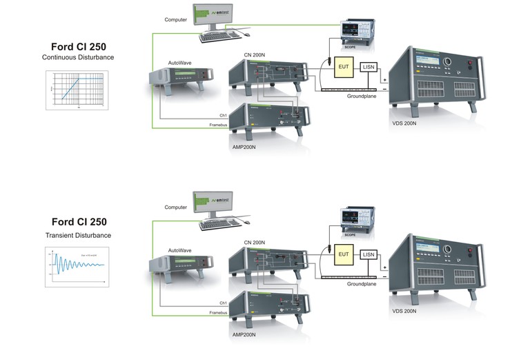 The AMP 200N can be used for testing the immunity to ground offset noise as per Ford EMC-CS-2009.1, CI 250. Both the continuous as well as the transient signal are generated by means of the AMP 200N, controlled by the AutoWave. The CN 200N is used to couple the test signals on to the line under test.
