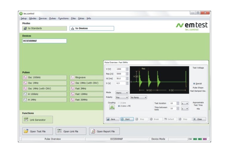 Outstanding user convenience, clearly structured windows and operation features and the EM TEST standards library along with the flexibility to generate user specific test sequences very easily are the main features of iec.control software. The software is automatically configured according to the connected EM TEST generators. Extensive reporting capabilities help the user to create test reports that meet international requirements.
