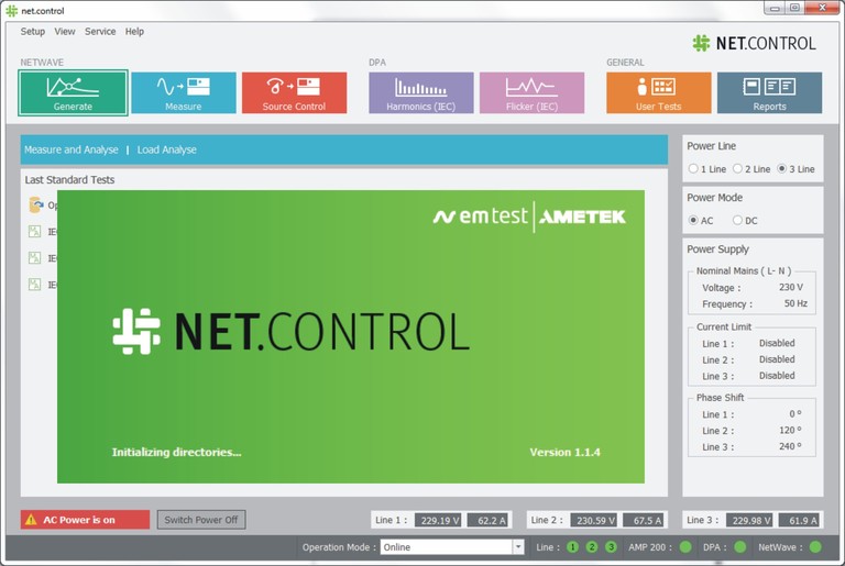 The programmable 3-phase AC/DC power sources with their wide frequency bandwidth offer powerful waveform generation capabilities for various test applications in the EMC area and for avionics testing. Based on a Dual-Processor technology, with an integrated high-performance PC, a digital signal processor (DSP) and equipped with a hard disk, the NetWave Series is capable to generate and record waveforms in realtime.